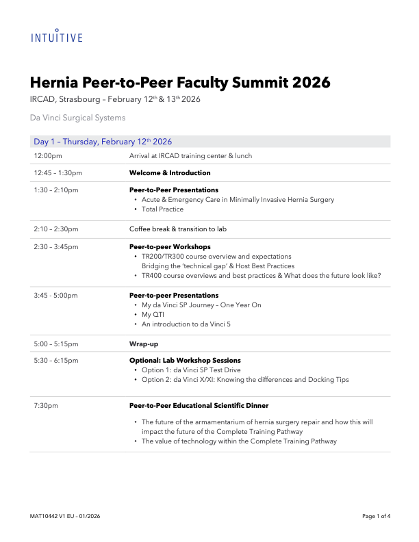 The Robotic Hernia Faculty Summit brings together a selected group of European surgeons actively involved in the development, teaching and proctoring of robotic hernia surgery and abdominal wall reconstruction.